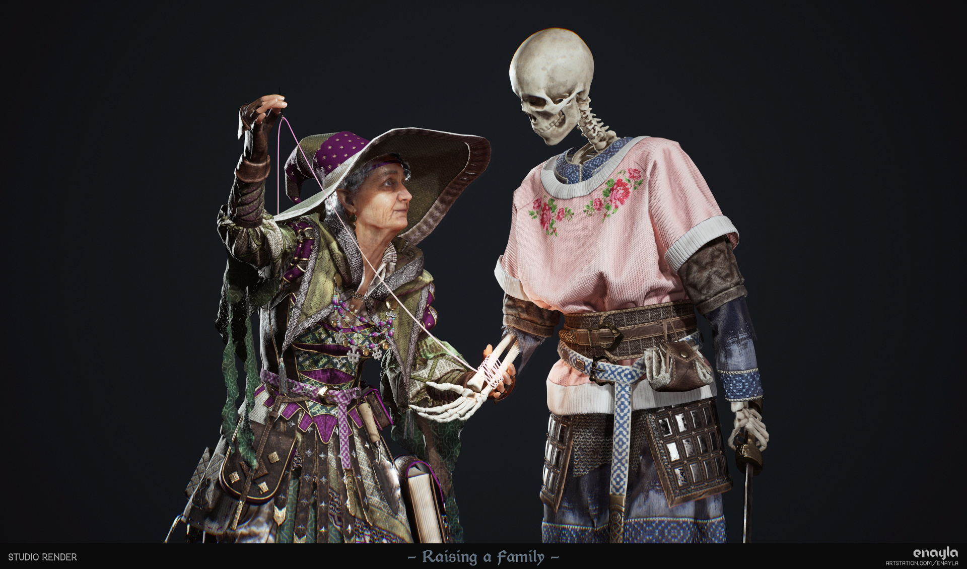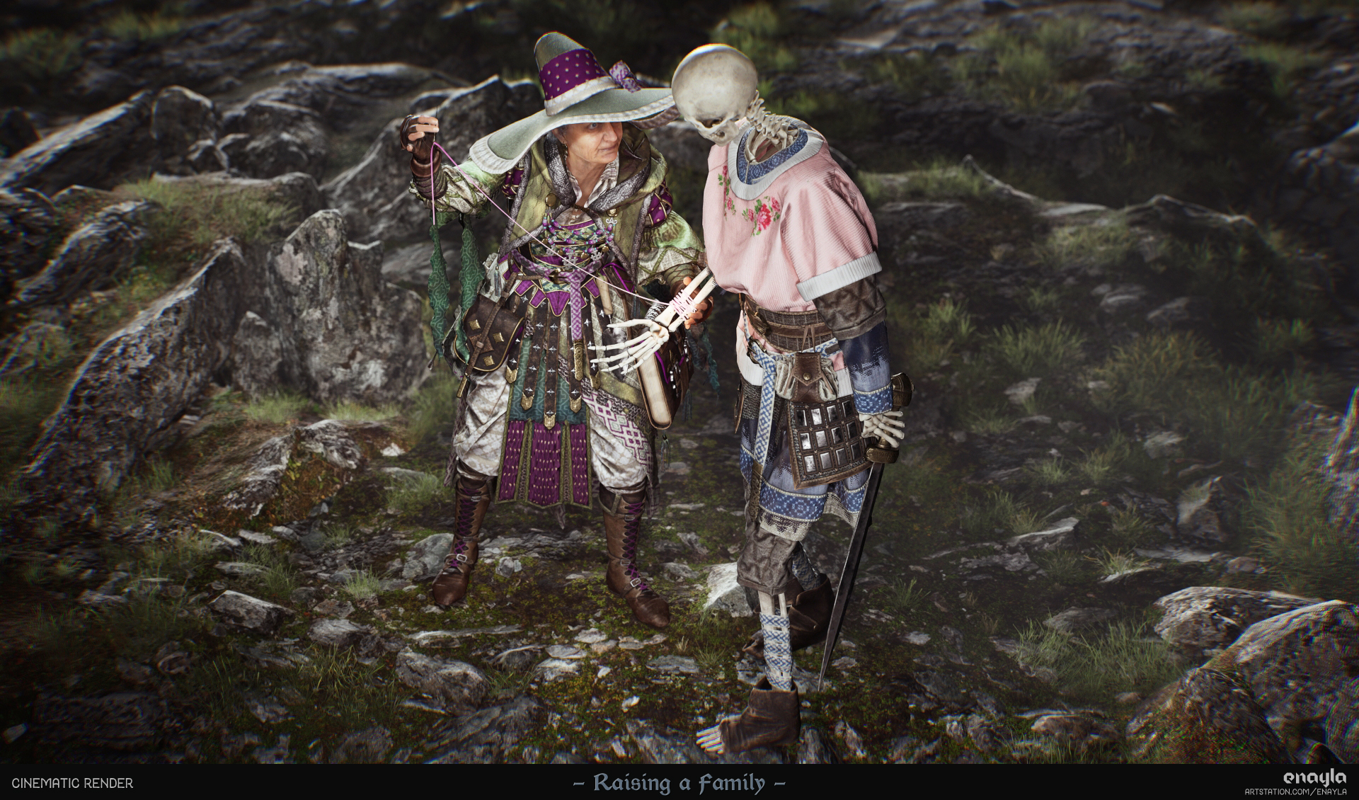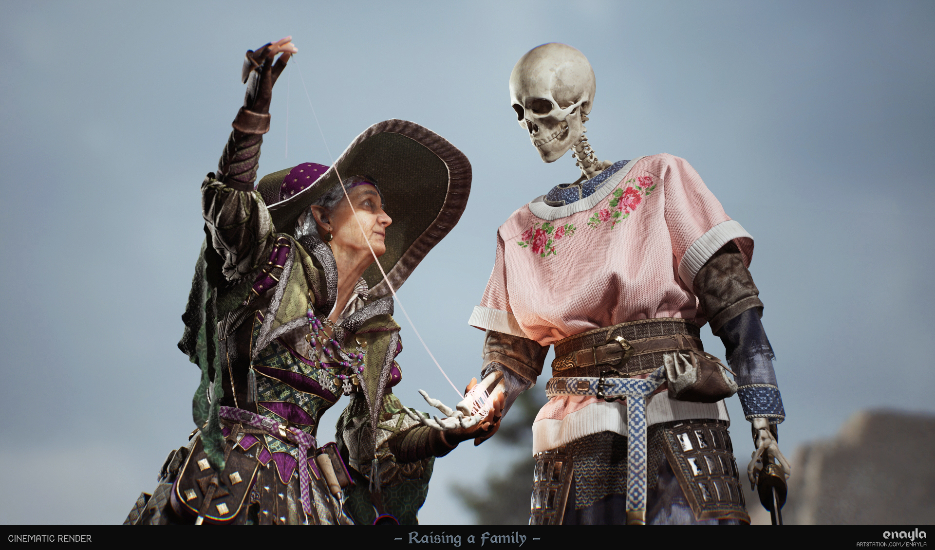 The result of the final project for my master’s degree in 3D Game Art. I sculpted my DnD characters: a grandmotherly necromancer and the skeleton familiar she dotes upon. Game-ready (~136k verts total) and rendered in Unreal Engine 5.