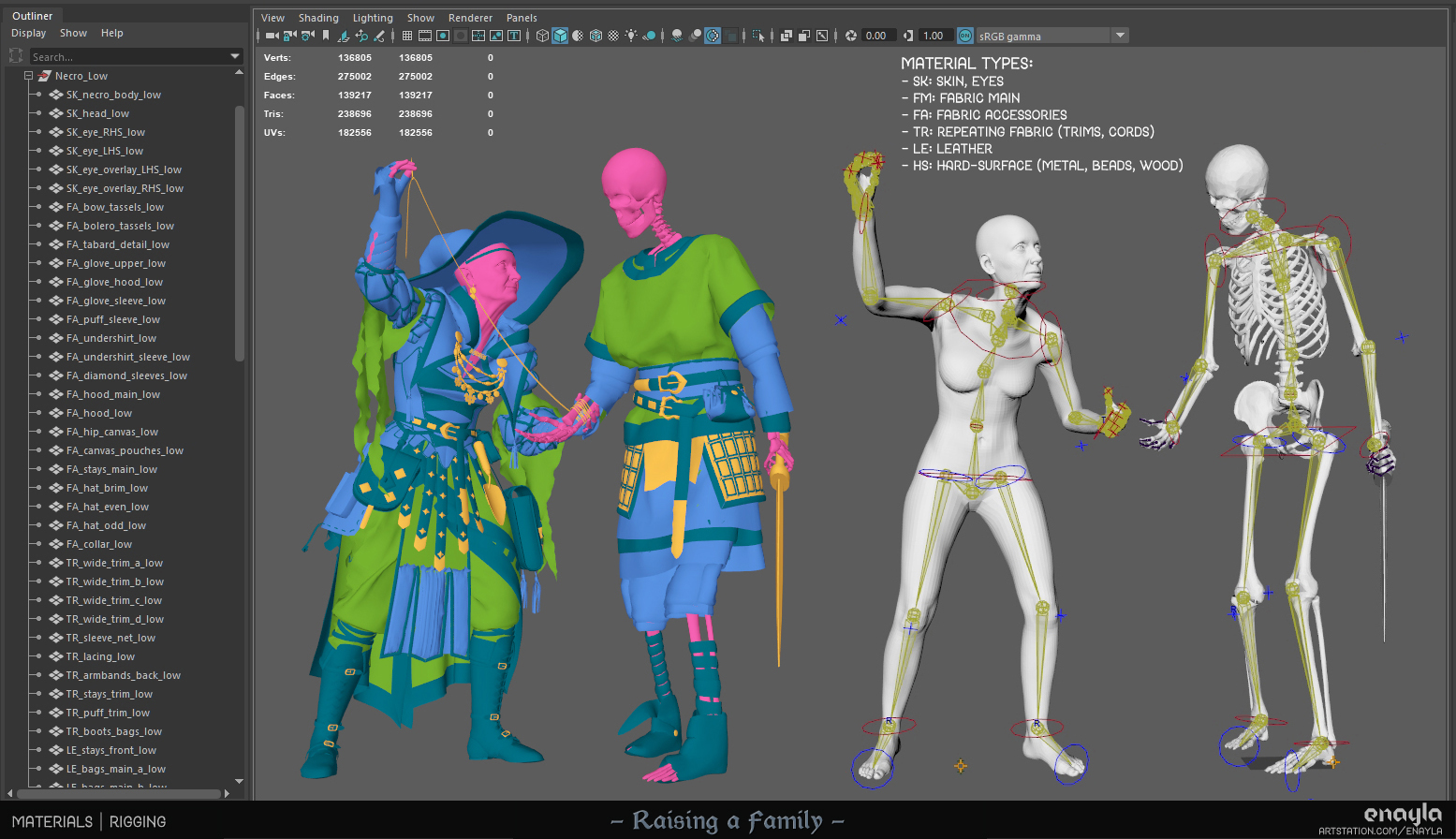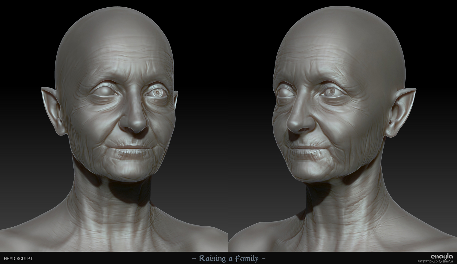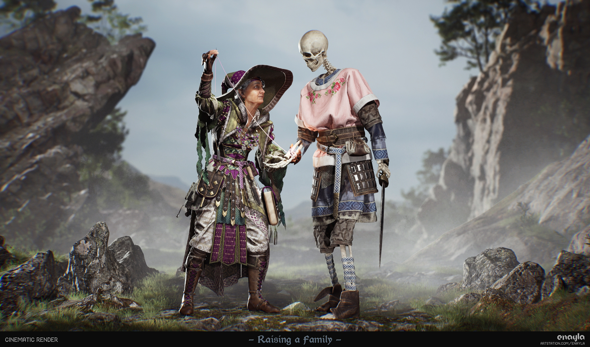 The result of the final project for my master’s degree in 3D Game Art. I sculpted my DnD characters: a grandmotherly necromancer and the skeleton familiar she dotes upon. Game-ready (~136k verts total) and rendered in Unreal Engine 5.