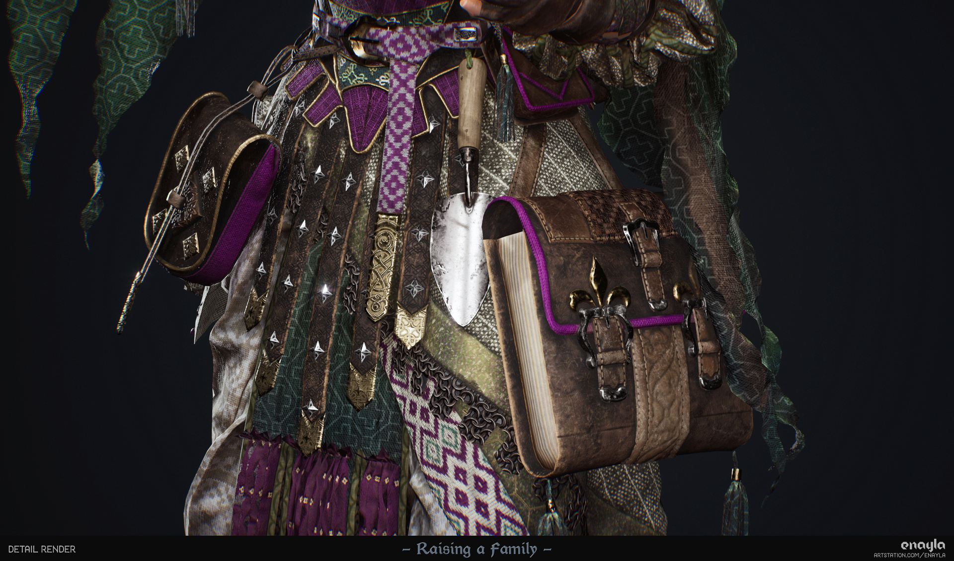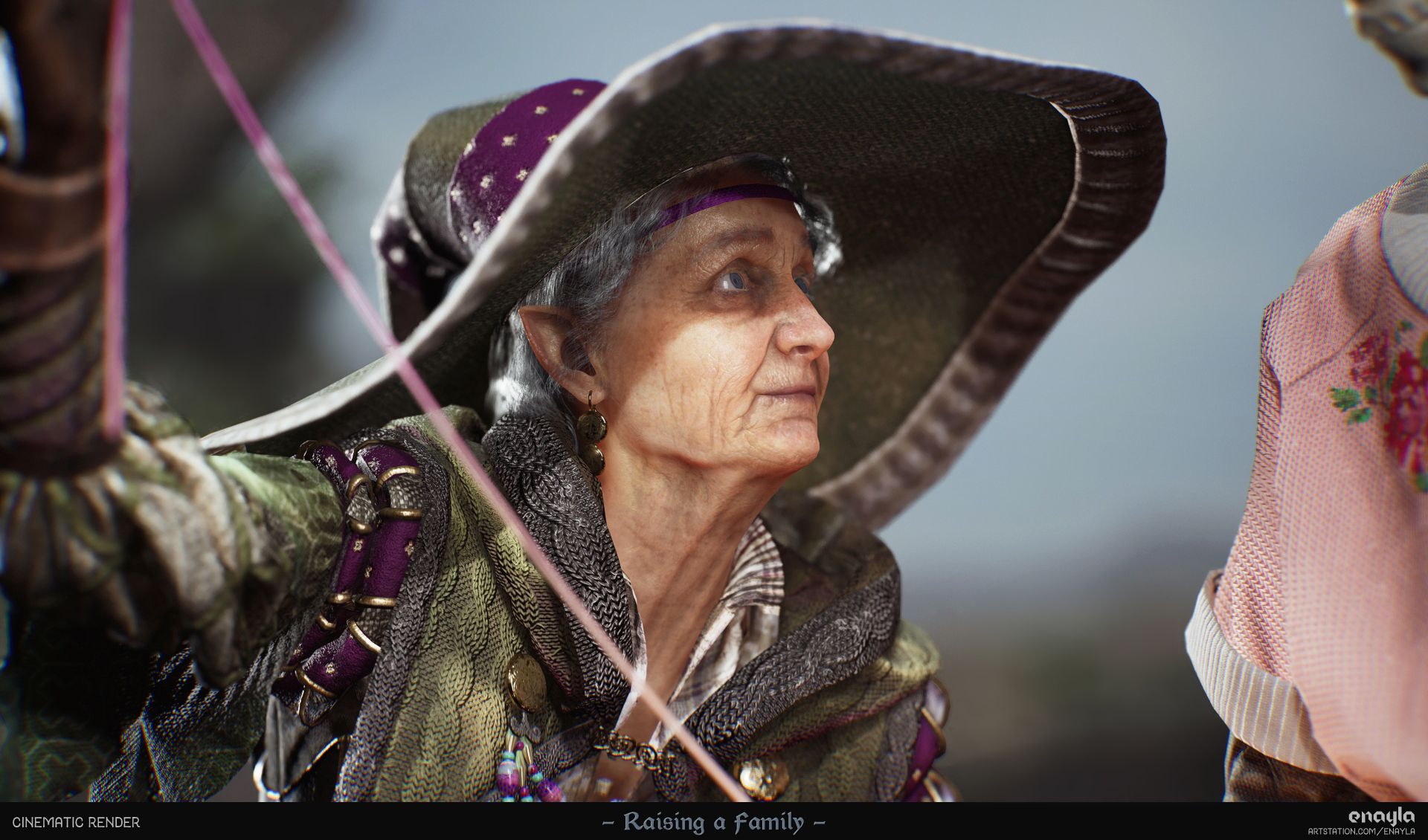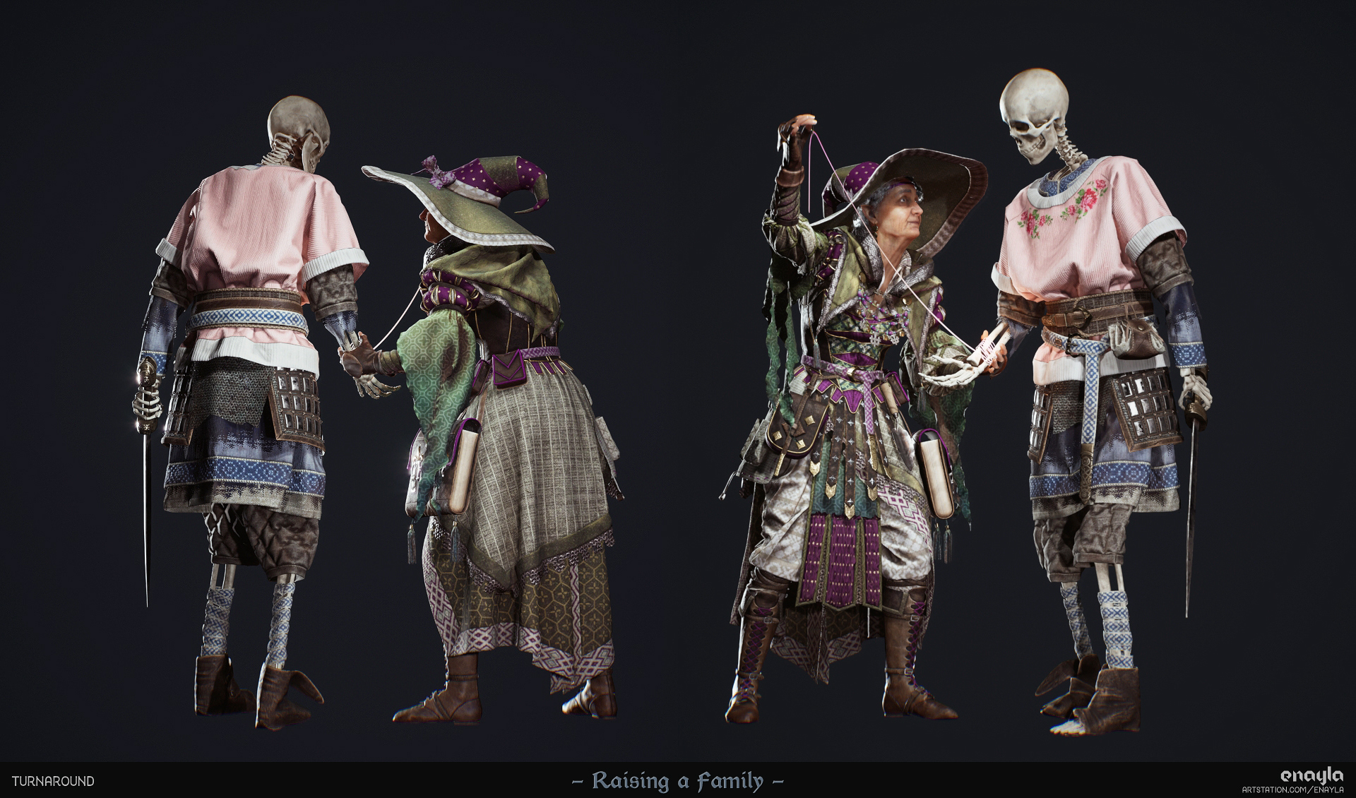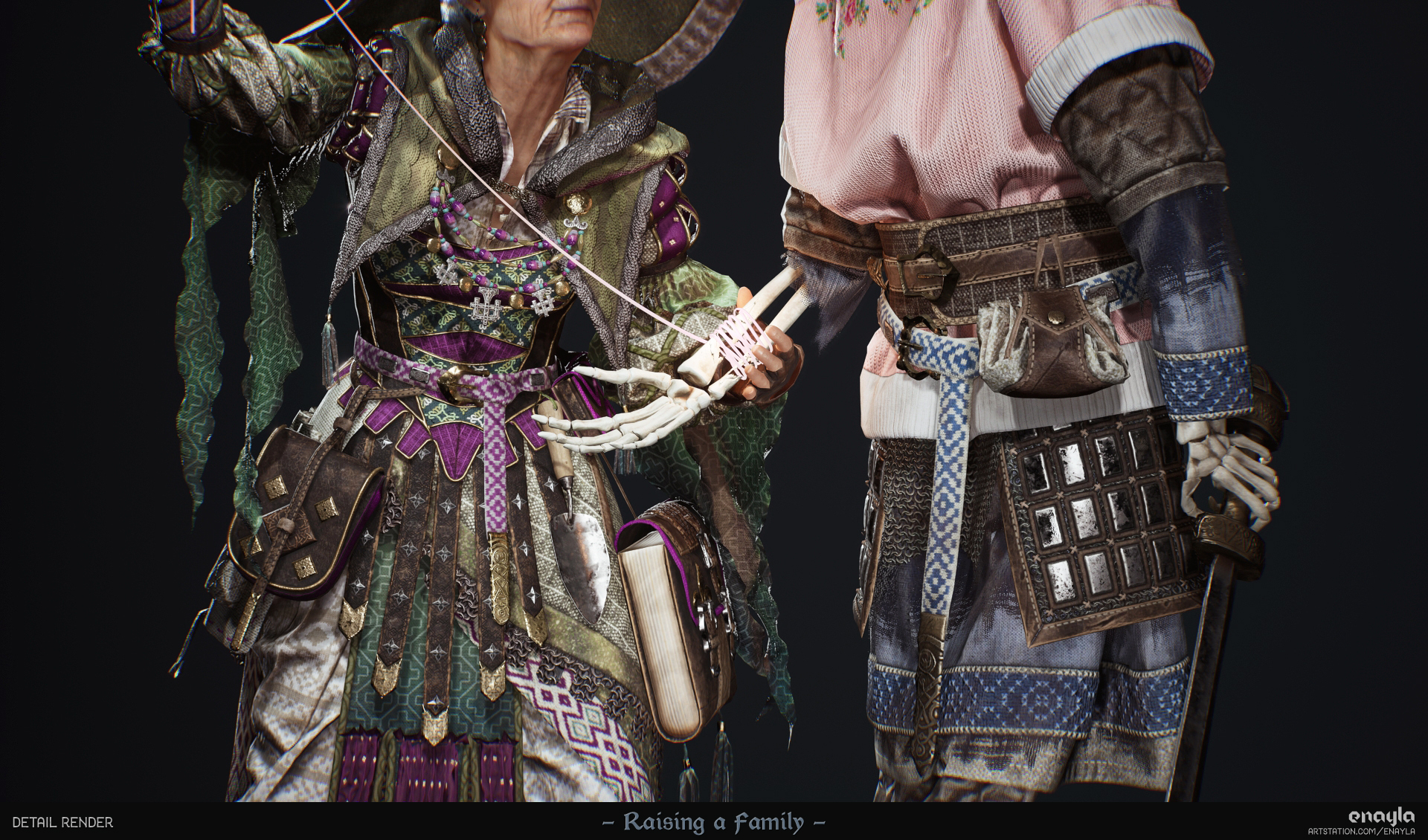 I took them through most stages of the game art pipeline: invented their designs, created the clothing in Marvelous Designer, sculpted face/body/accessories in ZBrush, did basic rigging/posing, retopology, and UVs in Maya, textured in Substance Painter, groomed in XGen, lit and rendered in UE5.